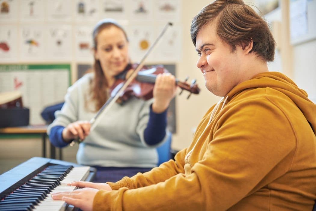 A real breakthrough for Salah came when Anna suggested that they sit next to each other and share the piano. He was able to copy some of Anna’s hand shapes and immediately hear when she played the same notes as him. Salah began to gain confidence in playing different notes and phrases simultaneously with each hand. He discovered the different voices on the keyboard and told his father that he really like the organ sound, as well as piano.